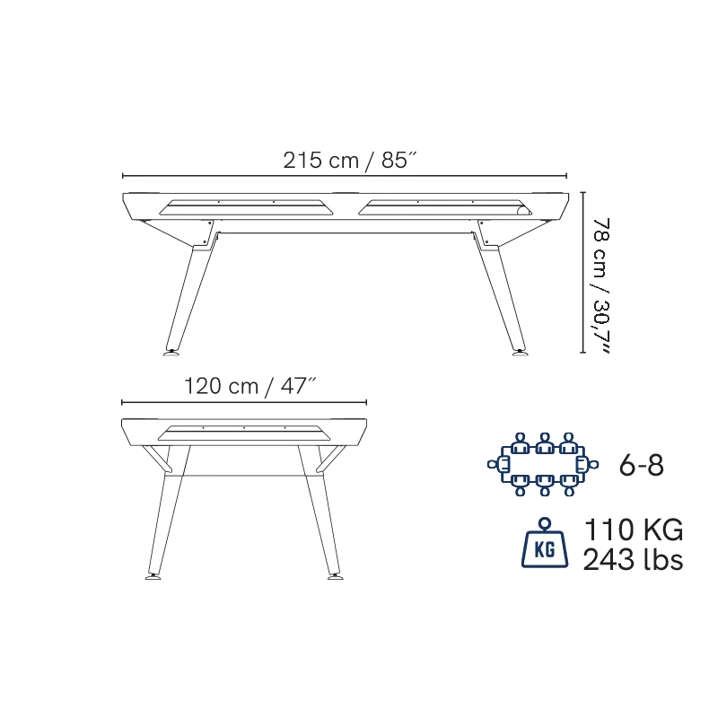 Dimensions extérieures du billard : 215 x 120 cm (75cm de hauteur)