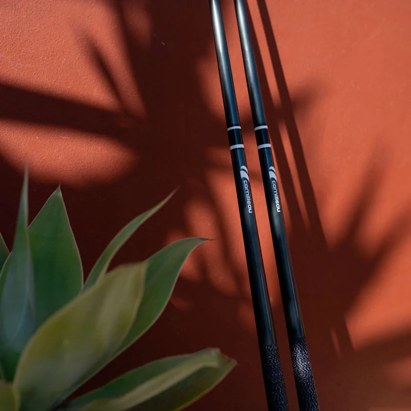 • 2 queues de billard en fibre de verre, couleur gris anthracite, en 2 parties à jonction 1/2, longueur 149 cm, poids 540 g, diamètre du procédé 13 mm, diamètre max du fût 32 mm