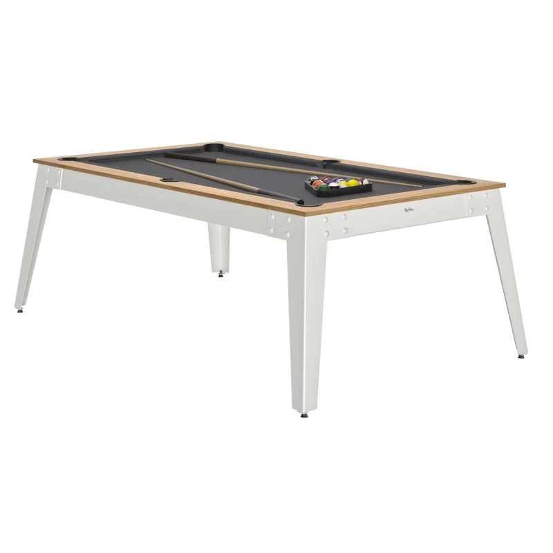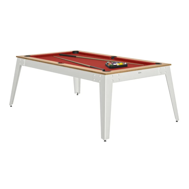 Le Billard Steel Noyer Vénice / Pieds Blancs associe le charme du bois foncé et la légèreté du métal clair. Élégant, robuste et précis, il s'impose comme une valeur sûre du design français signée René Pierre.