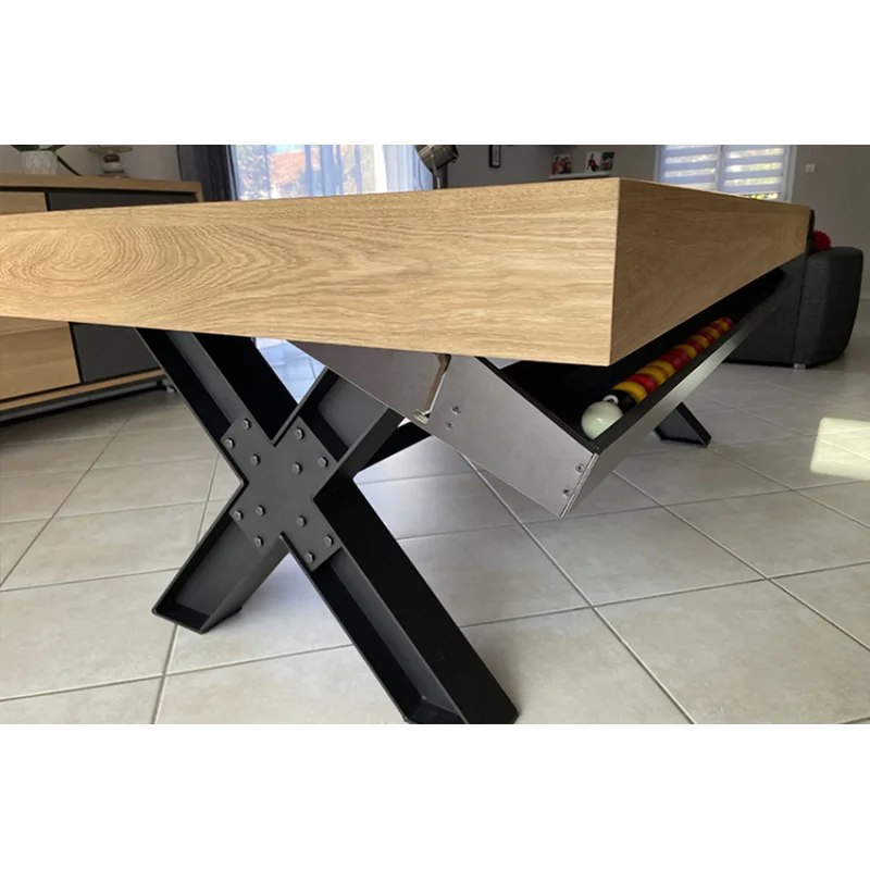 La table repose sur une structure solide combinant chêne massif et éléments en acier renforcé, assurant une stabilité exceptionnelle, même lors des parties les plus animées. Les matériaux de qualité supérieure résistent efficacement aux chocs et aux rayures, assurant une durabilité remarquable dans le temps. La combinaison bois massif et acier confère à ce billard une esthétique unique tout en garantissant une grande fiabilité à long terme.
