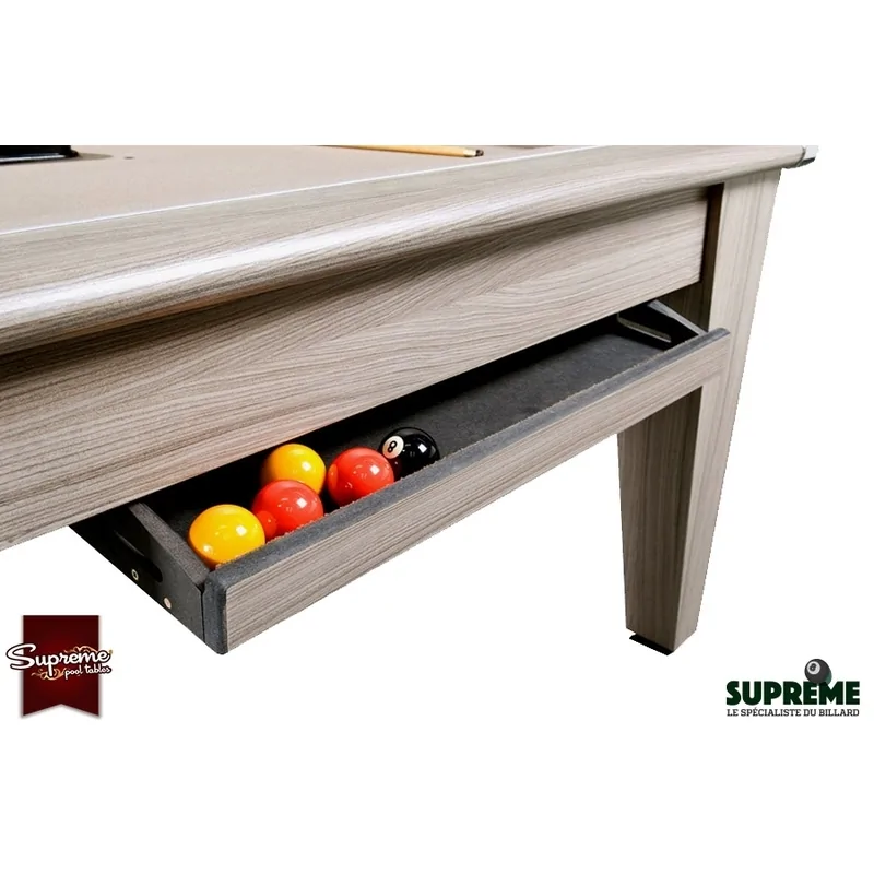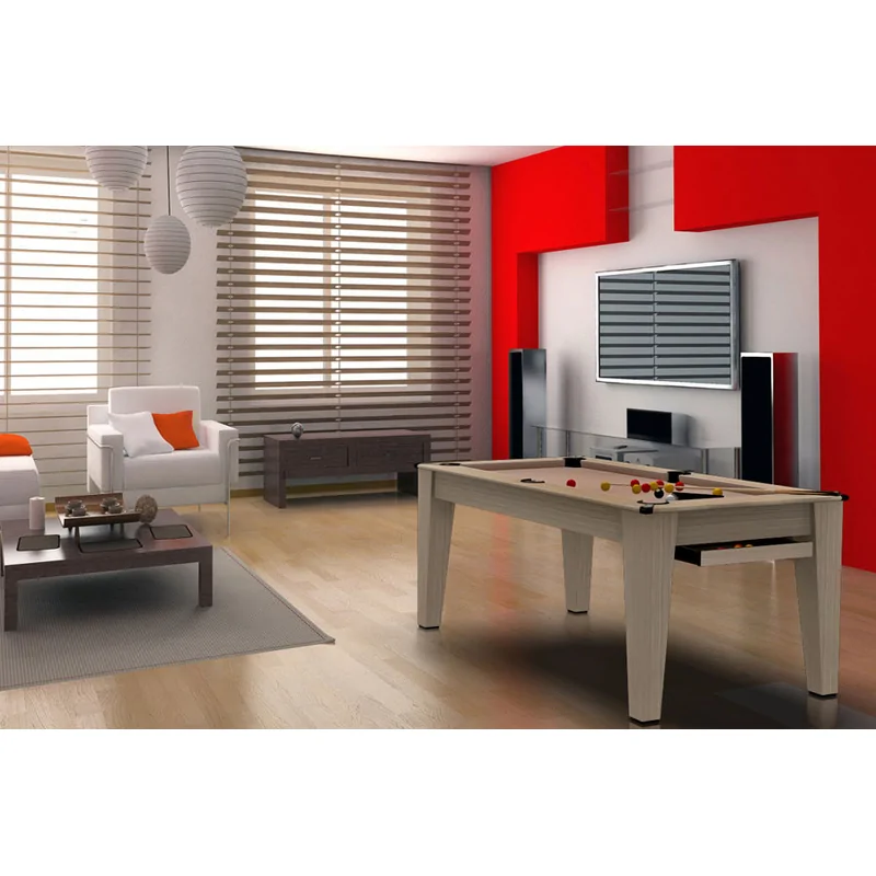 La table repose sur une structure solide et des pieds stables qui assurent une excellente stabilité, même lors des parties les plus animées. Les matériaux de qualité supérieure offrent une résistance accrue aux chocs et aux rayures pour une durabilité remarquable dans le temps. La finition bois flotté haut de gamme conserve son aspect naturel, même après un usage quotidien intensif, et s'intègre harmonieusement dans tous les styles d'intérieur.