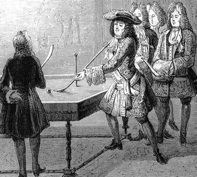 Elle figure dans l’ouvrage de C. Cotton The Compleat Gamester, cité par M. Shamos. Des gravures montrent aussi Louis XIV jouant au billard, un divertissement réservé à la noblesse. Pourtant, avant la Révolution, Paris comptait déjà de nombreuses académies fréquentées par joueurs et spectateurs.