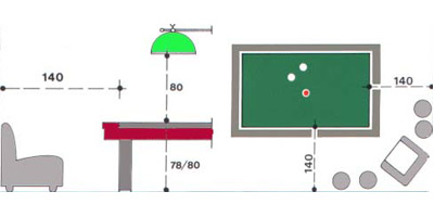 La dimension de la pièce dépendra donc de la taille du billard et de la longueur des queues que vous utiliserez. Le schéma ci contre vous présente les règles de base de l’implantation.