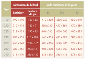 Afin de vous faciliter les calculs, nous vous proposons un tableau récapitulatif de la dimension de la pièce en fonction de la taille de votre billard et de la longueur des queues utilisées.