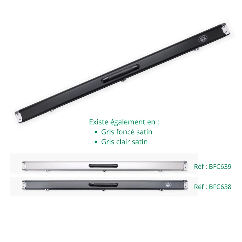 Le Boîtier Baize Master Prestige Noir Satin pour 2 queues Monobloc combine sécurité, design raffiné et confort d'usage, offrant aux joueurs de billard un accessoire haut de gamme pour transporter et protéger leurs queues avec style et sérénité