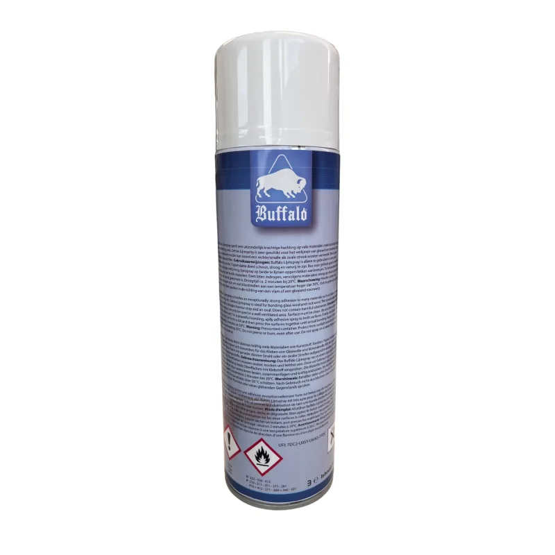 Mode d'emploi : N'utiliser Buffalo Lijmspray que dans un espace bien ventilé. La surface doit être propore, sèche et dégraissée. Bien agiter le bidon avant l'usage.