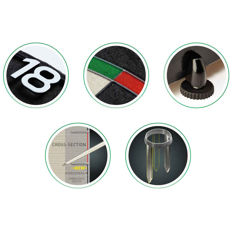 La Unicorn Eclipse Ultra se distingue par son système d'araignée métal ultra-fine, conçue pour réduire significativement les rebonds (bounce-outs). Grâce à cette technologie, la surface de jeu est optimisée et les fléchettes se logent plus facilement dans les segments. Cette conception améliore la précision de jeu et maximise les chances de scoring, un avantage appréciable pour les joueurs recherchant performance et régularité.