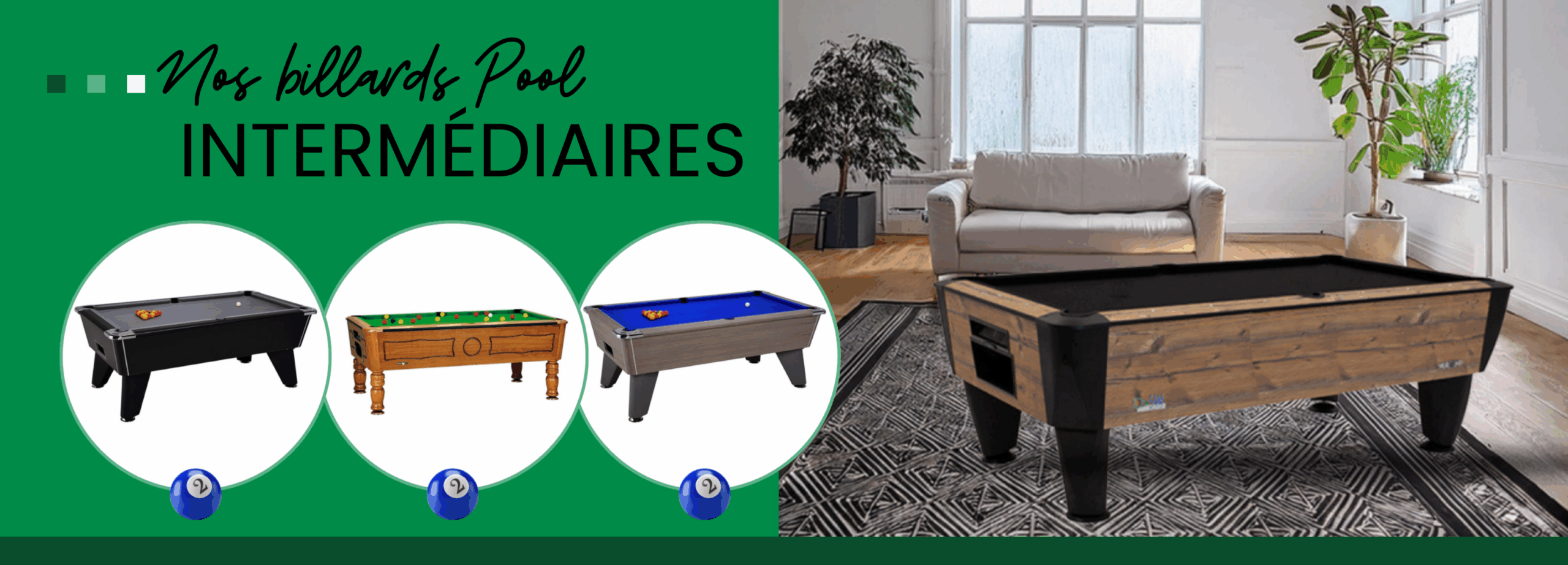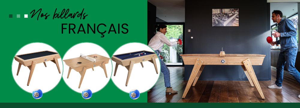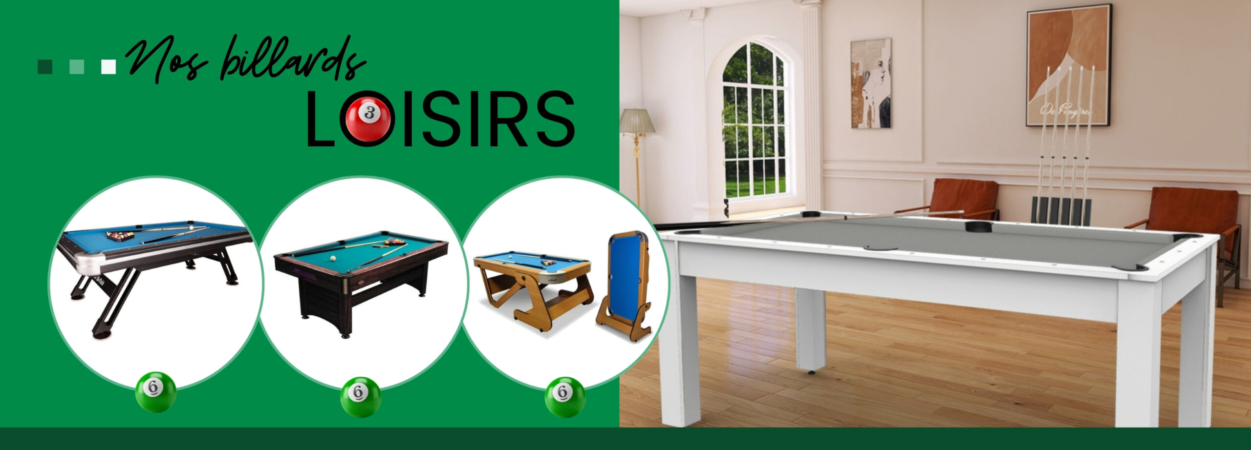 Vous trouverez des billards pour le jeu de pool anglais, de snooker ou de billard américain. Les pieds sont généralement pliables pour faciliter le rangement. Le tapis est de bonne qualité.