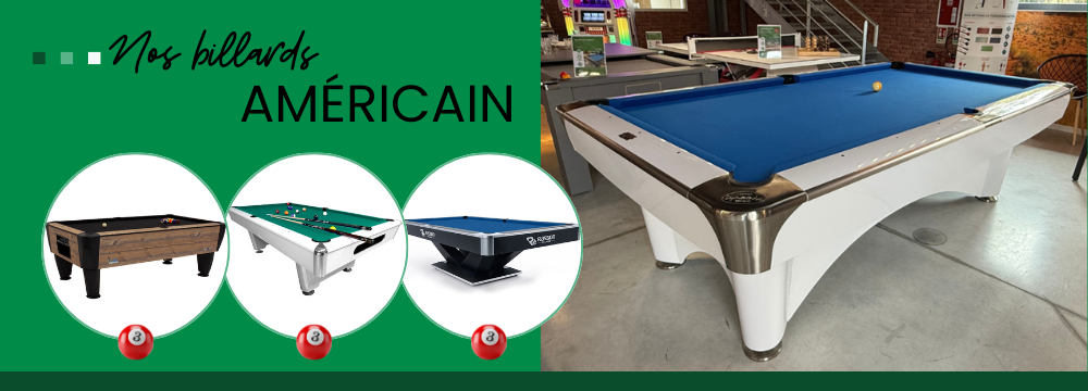 | Américain | 9FT | 6 poches droites – tapis rapide | 15 billes numérotées de 57mm et une bille blanche. | 8FT et 10FT |