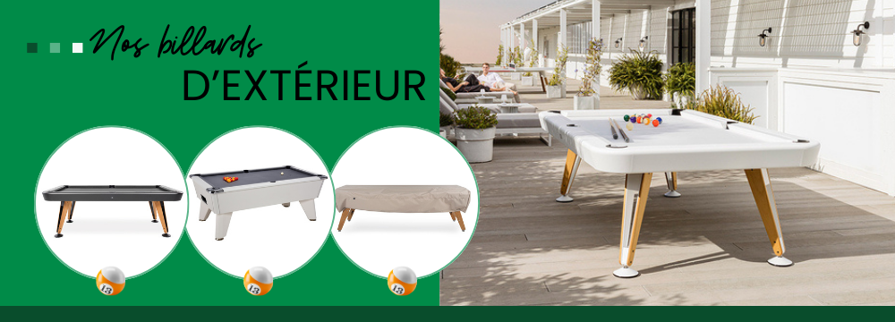 Certains billards sont convertibles et peuvent se transformer en table de repas ou de jardin, ainsi ils permettent de concilier loisir et praticité. La gamme inclut plusieurs références haut de gamme comme l’Omega Dom Extérieur ou les billards RS Barcelona Diagonal, disponibles en 7 ft et 8 ft, avec des finitions élégantes.