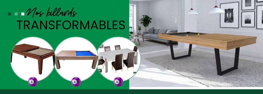 En effet, grâce à un plateau amovible ou coulissant, il se transforme facilement en table de repas ou en bureau, offrant ainsi un gain de place considérable. Ces billards sont particulièrement adaptés aux intérieurs où chaque mètre carré compte, sans renoncer à l’esthétique ni à la qualité de jeu. Les billards transformables en table sont disponibles en différentes tailles, du 6 ft au 8 ft. Ils se déclinent en plusieurs styles : modernes, design ou traditionnels, afin de s’harmoniser avec tout type de décoration. Les billards transformables en table sont conçus avec des matériaux robustes comme le bois massif et l’ardoise, garantissant la stabilité et la précision de vos parties de billard.