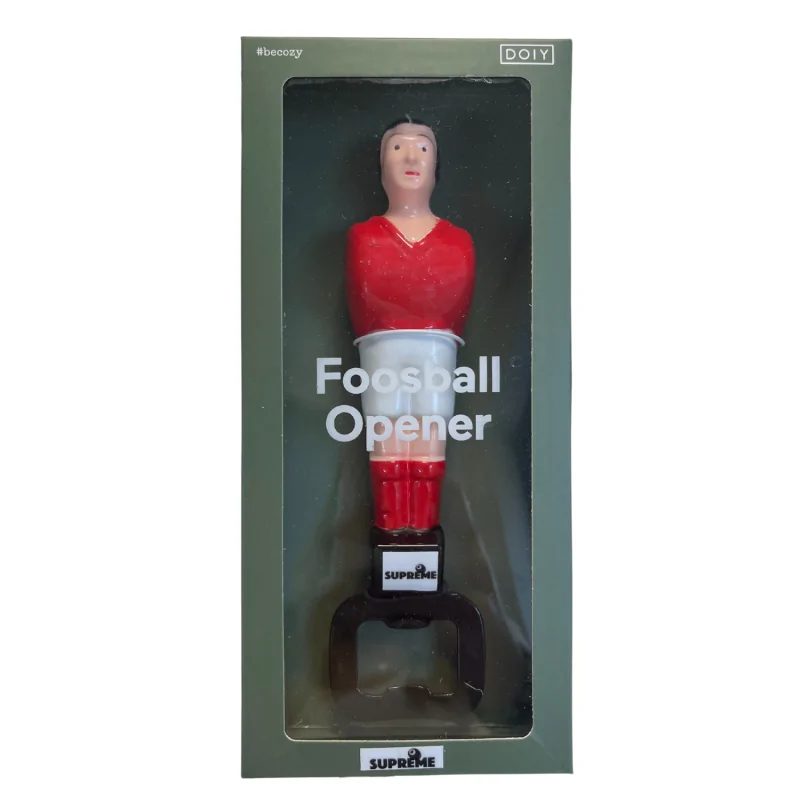 Le décapsuleur baby-foot rouge est conçu pour tous les amateurs de baby-foot souhaitant combiner passion et praticité. Il permet d'ouvrir vos bouteilles rapidement tout en apportant une touche originale et colorée à votre espace de jeu. Inspiré du design des baby-foot, ce décapsuleur est à la fois ludique et décoratif, parfait pour la maison, un bar ou un club.