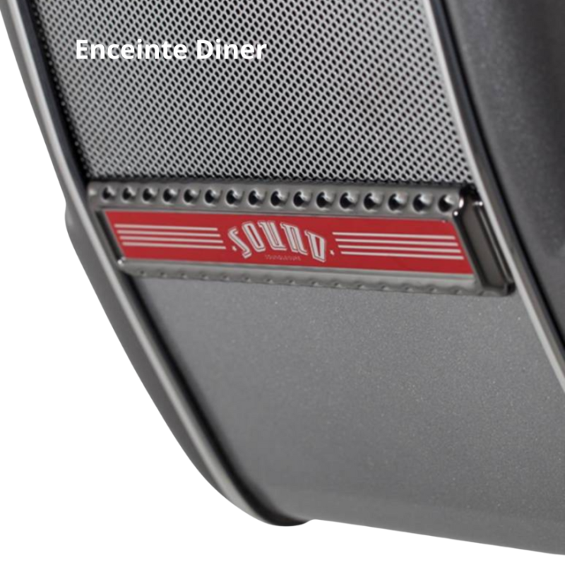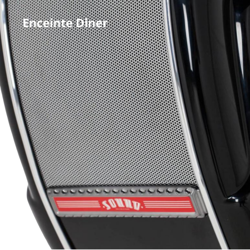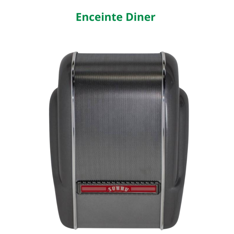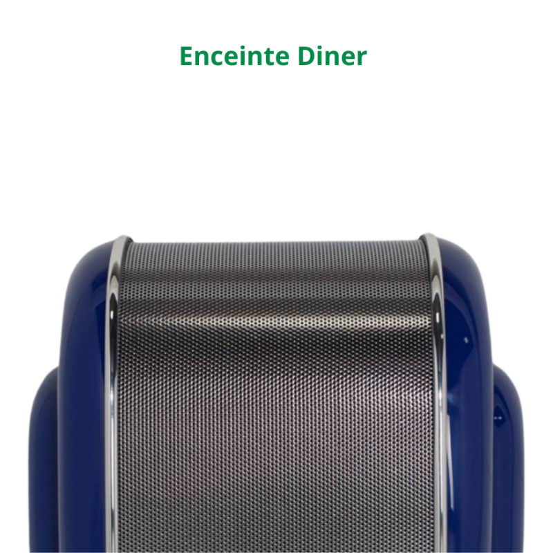 Design : Il arbore un style rétro typique des diners américains, avec des finitions disponibles en bleu royal, blanc, cème gris, noir, rouge ou turquoise. Son boîtier central en contreplaqué marin et ses contours latéraux en acrylique, ainsi que sa plaque frontale et sa grille en acier, lui donnent une allure distinctive et élégante.