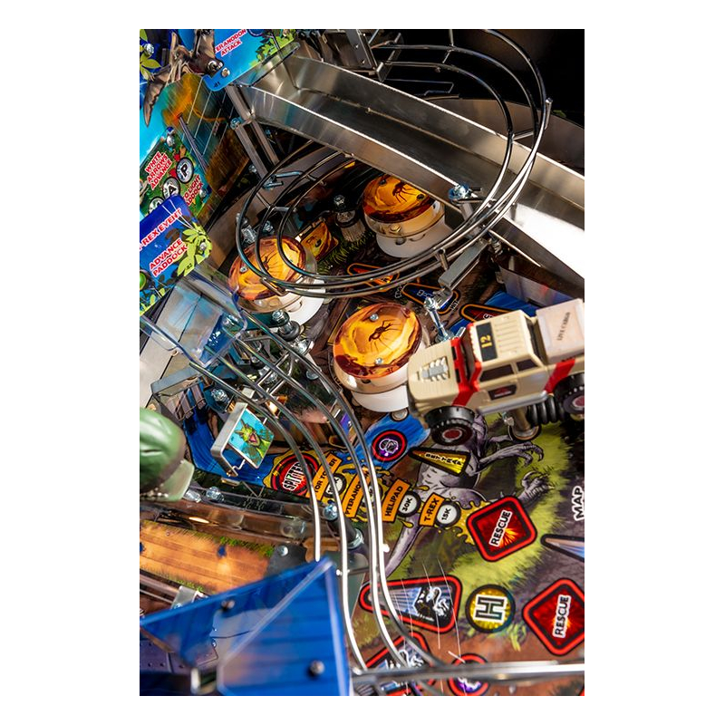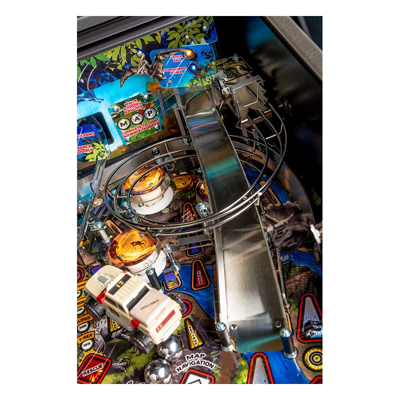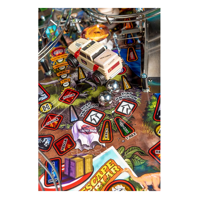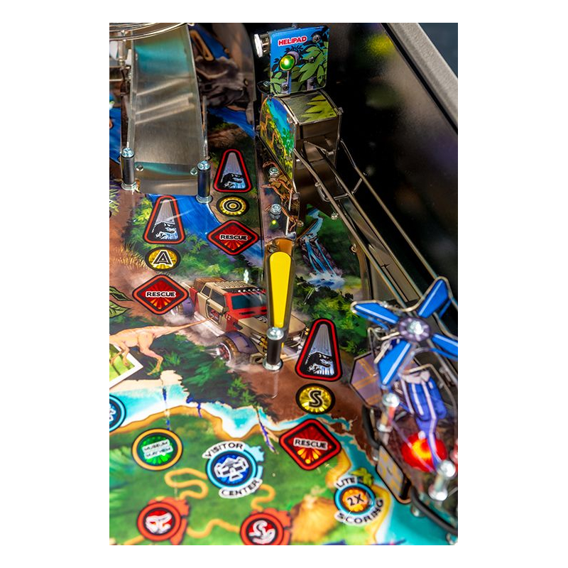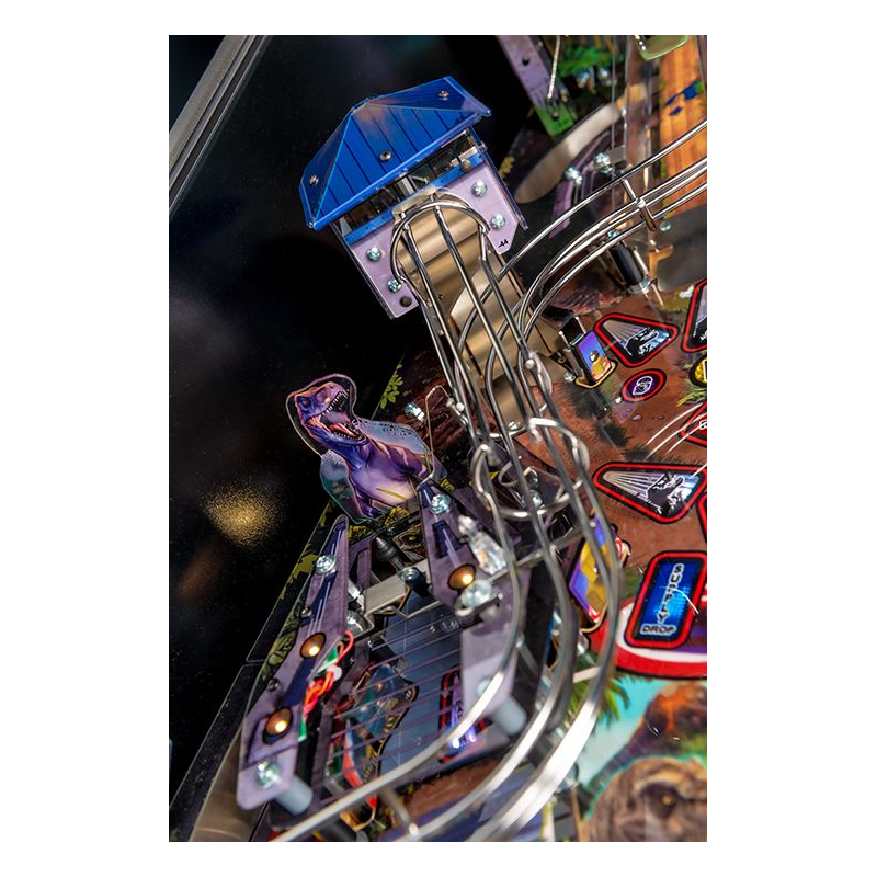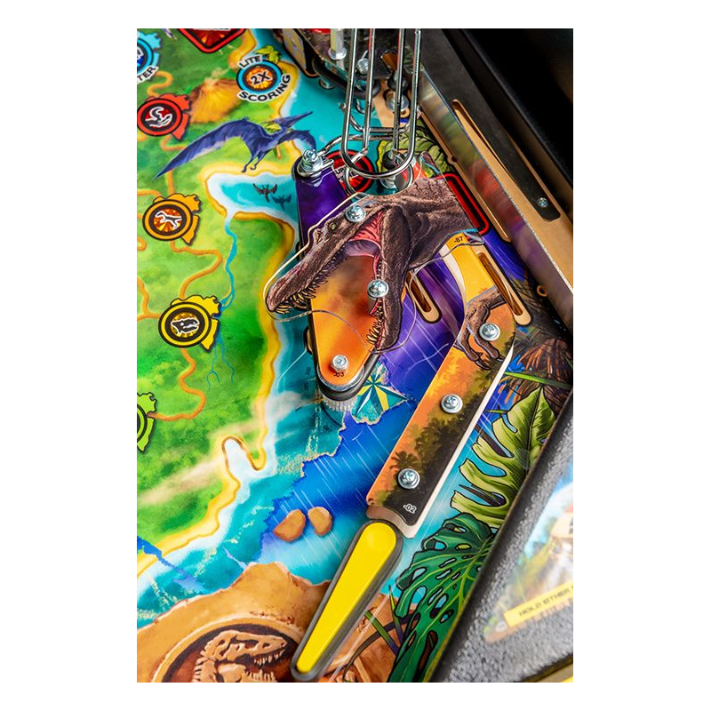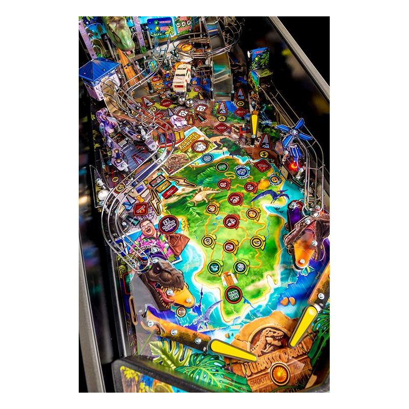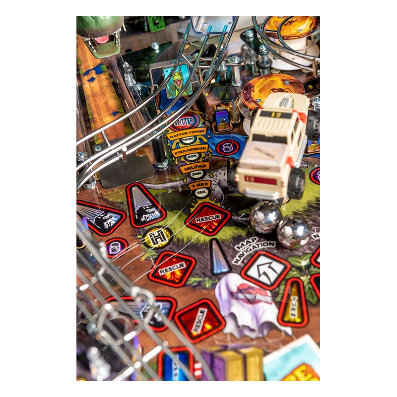 Les modèles Pro et Premium sont également dotés d'une cible « Véhicule d'aventure dans la jungle » au centre du plateau de jeu : une bille de Newton rotative. Cette cible cinétique enregistre les tirs directs, détermine la direction de déplacement des joueurs sur l'île et active les modes T-Rex. Ils comprennent trois flippers de taille standard, quatre rampes personnalisées, une cible « Cracheur » rotative, un système de verrouillage vertical sur les couloirs pour des tirs précis et des illustrations originales dessinées à la main mettant en scène les dinosaures emblématiques de la série.