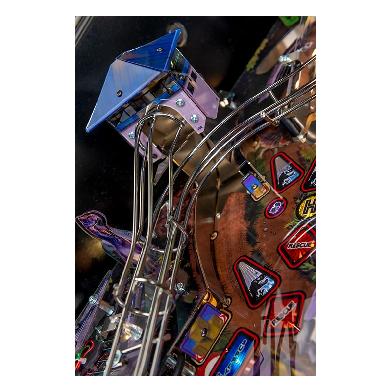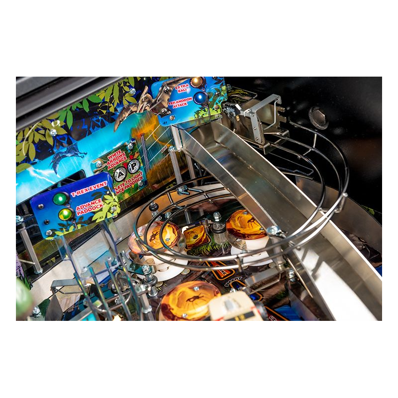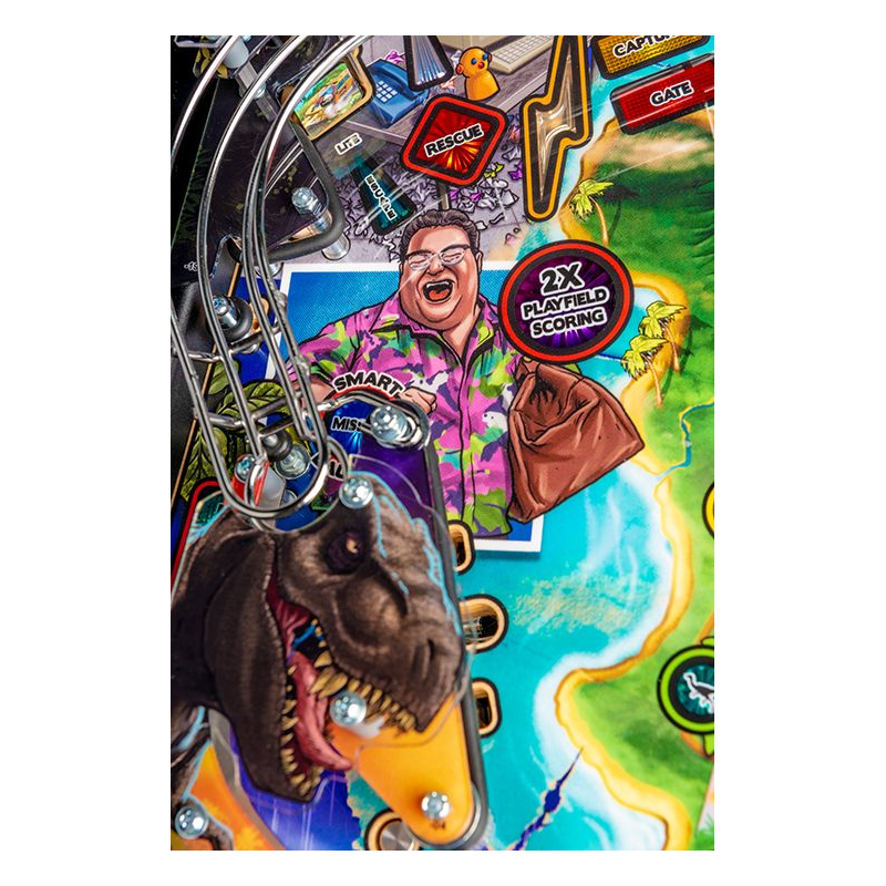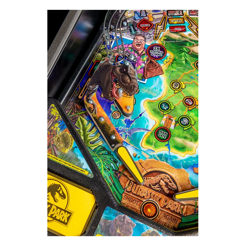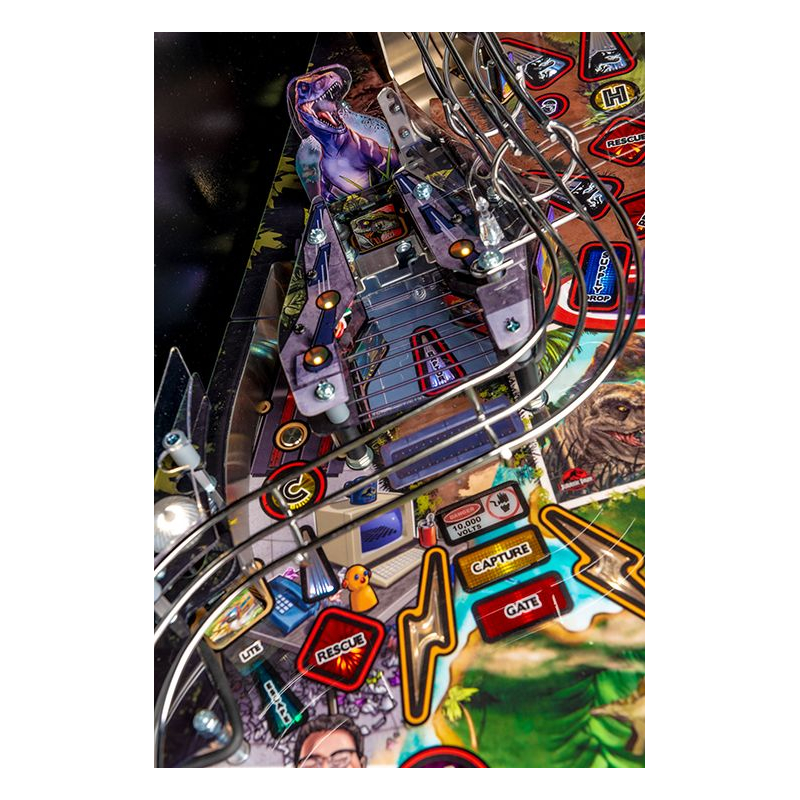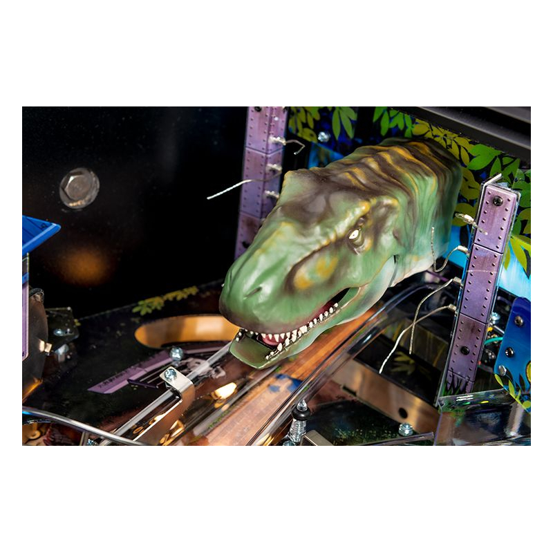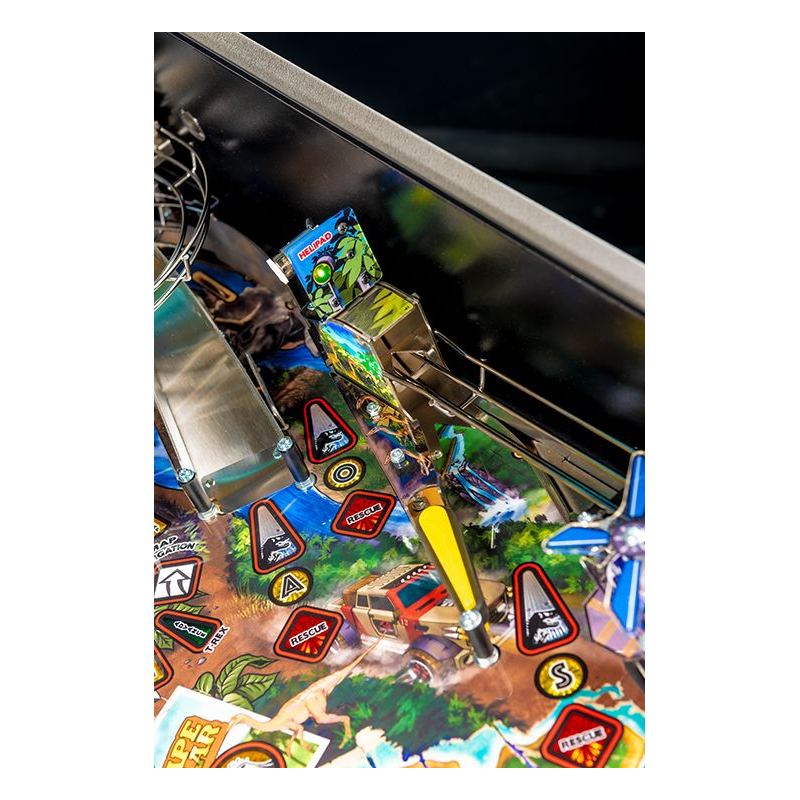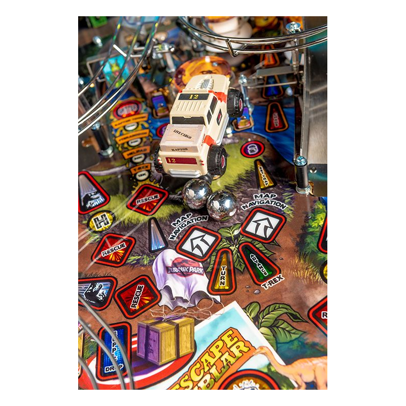 Les modèles Pro et Premium sont également dotés d'une cible « Véhicule d'aventure dans la jungle » au centre du plateau de jeu : une bille de Newton rotative. Cette cible cinétique enregistre les tirs directs, détermine la direction de déplacement des joueurs sur l'île et active les modes T-Rex. Ils comprennent trois flippers de taille standard, quatre rampes personnalisées, une cible « Cracheur » rotative, un système de verrouillage vertical sur les couloirs pour des tirs précis et des illustrations originales dessinées à la main mettant en scène les dinosaures emblématiques de la série.