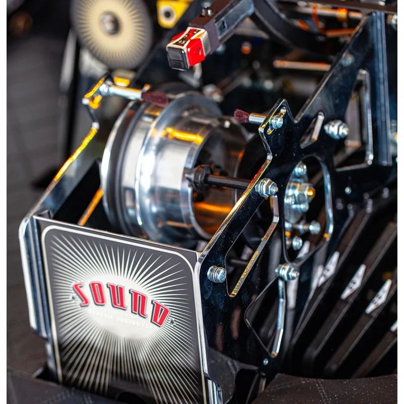 Le Streamliner Rocket de Sound Leisure allie élégance rétro-chic et technologie moderne. Assemblé à la main au Royaume-Uni, il se distingue par sa carrosserie métallisée argentée polie, ses panneaux inférieurs à texture pyramide et son intérieur en simili-cuir matelassé en losanges. La grille de haut-parleur en « V » chromée, les boutons en aluminium brossé et l'éclairage LED discret créent une ambiance chaleureuse et raffinée, tandis que le logo Sound Leisure en métal massif illumine le meuble avec style.
