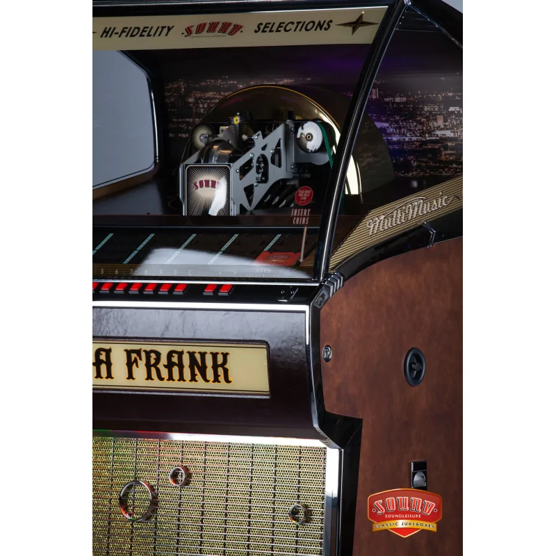Ce jukebox peut accueillir jusqu'à 70 vinyles 7 pouces, offrant 140 sélections grâce à la lecture automatique des faces A et B. Son mécanisme sophistiqué soulève, retourne et positionne chaque disque avec précision, créant un spectacle mécanique authentique à chaque lecture. Le présentoir rotatif facilite la navigation et rend la sélection intuitive et agréable.