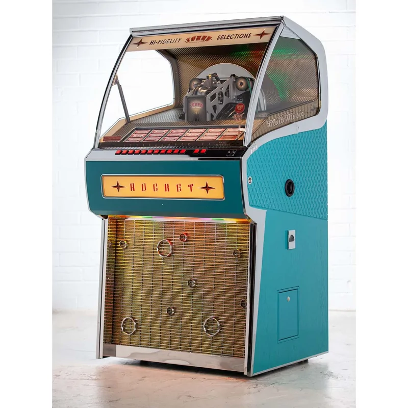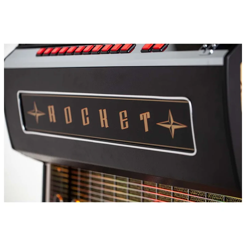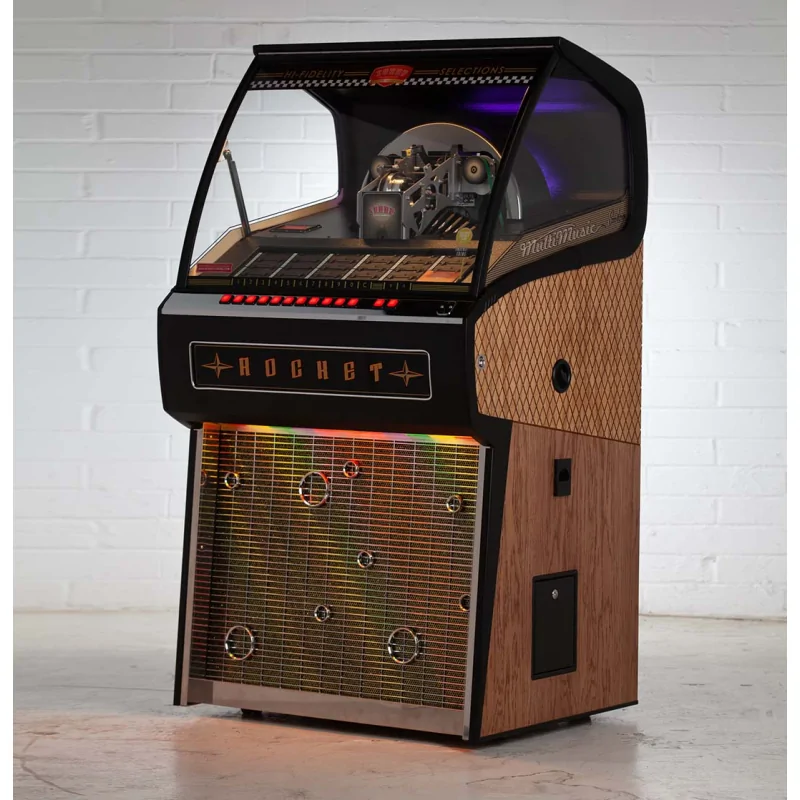 Fabriqué à la main au Royaume-Uni, le Rocket perpétue la tradition des caisses en bois monobloc. Il est disponible dans plusieurs finitions, dont chêne naturel, turquoise, rouge ou gris anthracite, assurant un jukebox unique et élégant adapté à tous les environnements.
