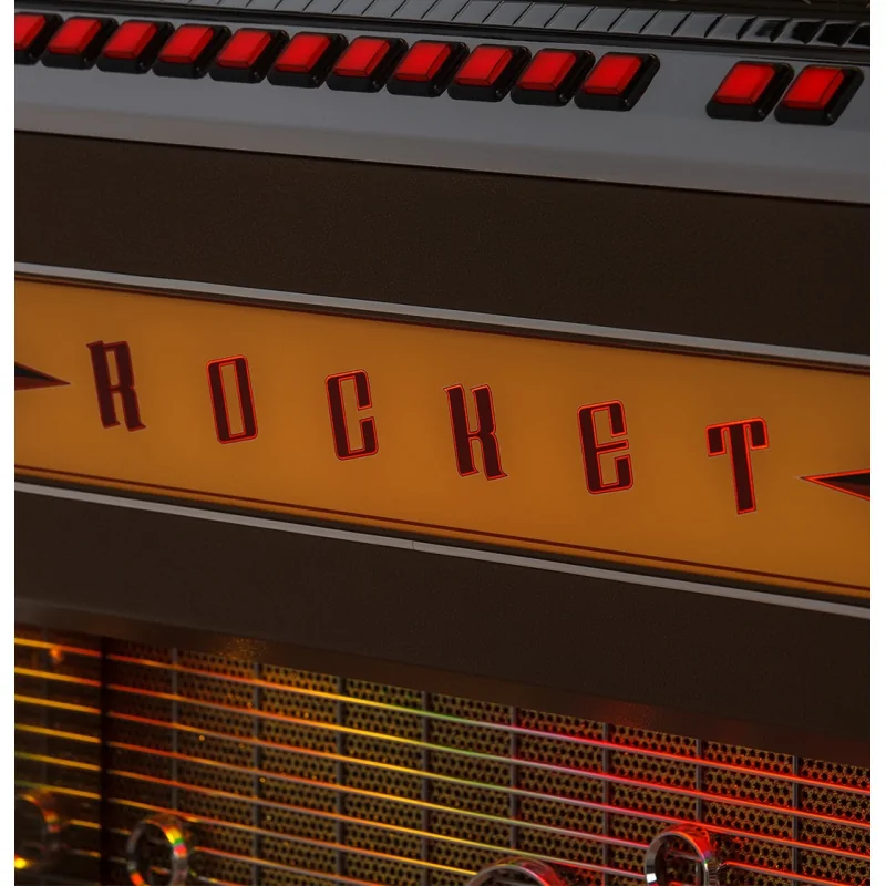 Le Rocket Vinyl Jukebox dispose d'un éclairage LED intégré, sublimé par le Diamond Pack qui offre dix thèmes lumineux programmables et réglables pour chaque zone, y compris tubes, façade et mécanisme. La lecture, le volume, le mode aléatoire, le rejet de disque et l'intensité lumineuse se contrôlent facilement via les boutons frontaux ou la télécommande infrarouge.