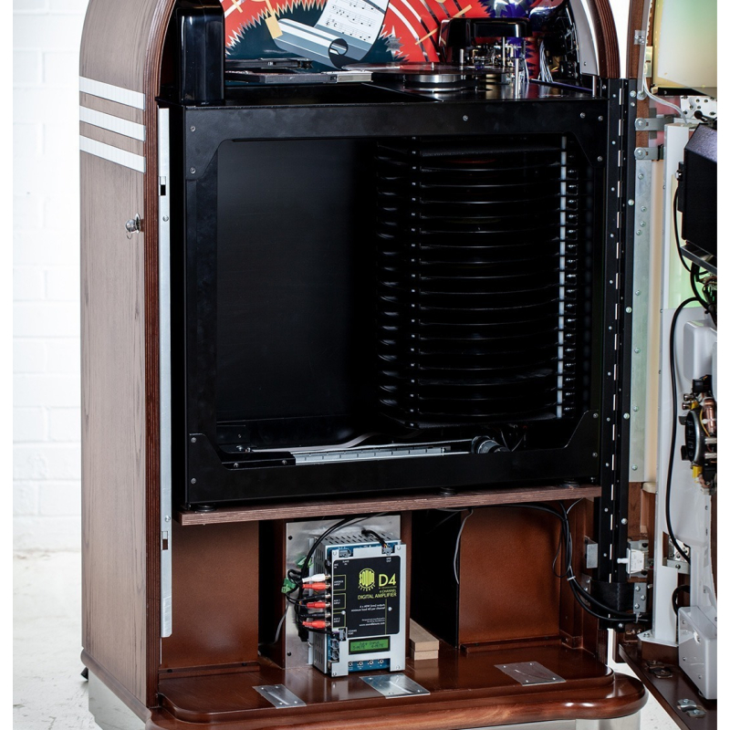 Au cœur de ce meuble d'exception se trouve le mécanisme breveté 'autoflip' pour vinyles 12, capable d'accueillir 20 disques LP, y compris des singles 12, et de gérer automatiquement la lecture des faces A et B à la vitesse appropriée. Vous serez fasciné par la précision du bras qui prélève, retourne et place le vinyle sur la platine, assurant un spectacle mécanique aussi élégant qu'immersif.