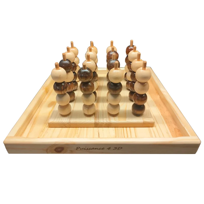 Le puissance 4 en 3 dimensions est un jeu de stratégie, de rapidité et de technique ! C'est un jeu ludique et esthétique. Le bois, pin sylvestre et hêtre pour les perles, est issu de forêts locales gérées durablement. la finition est une laque mélamine adaptée aux jeux en bois