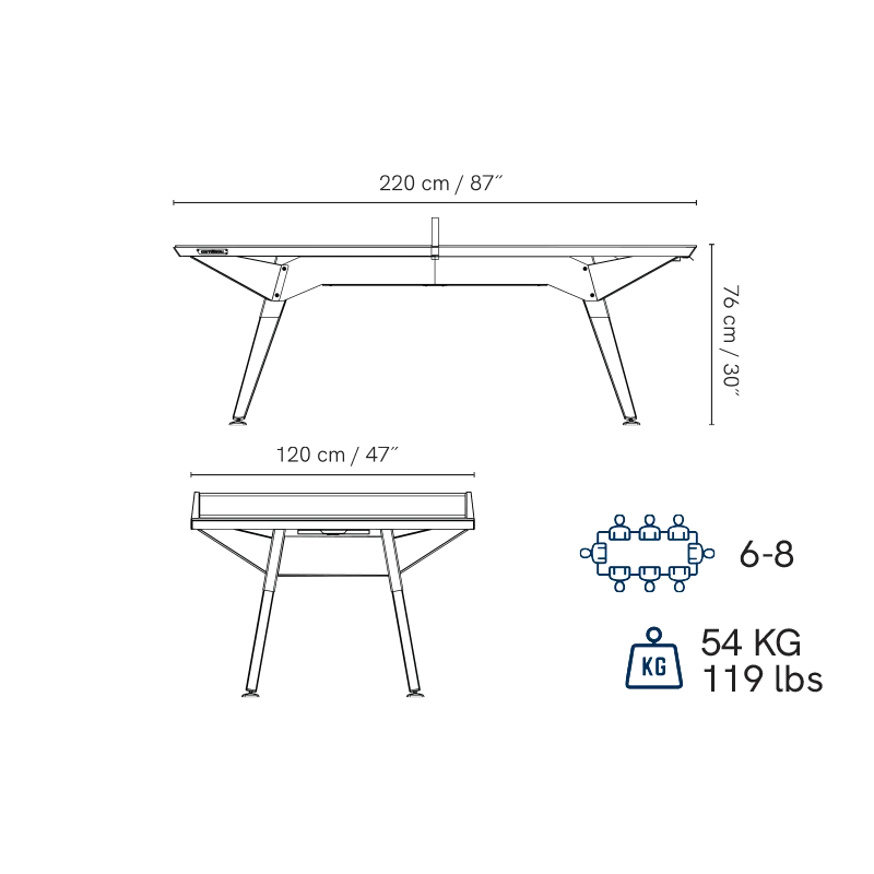 Dimensions extérieures de la table : 220 x 120 cm ( 76cm de hauteur)