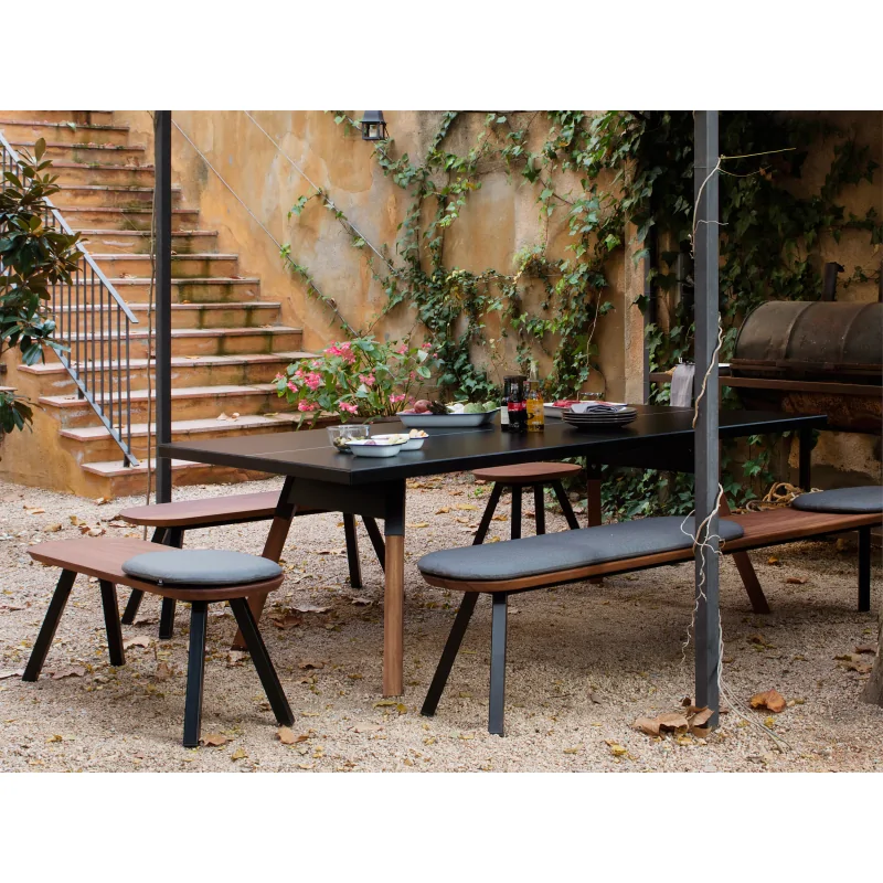 Pour préserver le plateau HPL noir, utilisez une housse de protection lorsque la table n'est pas utilisée, en particulier pour un usage en extérieur afin d'éviter la décoloration par le soleil. Nettoyez régulièrement la surface avec un chiffon doux pour maintenir son esthétique et sa durabilité. Les finitions bois sont exclusivement destinées à un usage intérieur.