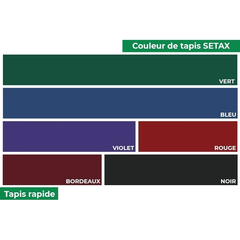 Équipé du système SETAX, ce tapis utilise des bandes Velcro industrielles pour une fixation rapide et sécurisée. Fini les agrafes et la colle : il se pose en quelques minutes, directement sur les bandes prévues à cet effet. Cette technologie facilite l'entretien régulier de la table et permet un remplacement rapide pour un usage domestique ou intensif dans les bars et salles de jeux.